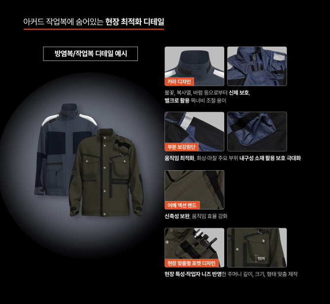 1인치 내외의 깊이 조정으로 도구 낙하를 방지한 '깊은 주머니', 소재의 제한된 신축성을 보완하고 팔의 움직임을 돕는 '어깨 액션밴드', 고온·분진 많은 환경에서도 내구성을 유지하는 '비슬론 지퍼와 플라켓 디자인' 등이 대표적이다. 이외에도 소재 두께 조절, 손상 부위 교체가 쉬운 벨크로 디자인, 바디캠·무전기 홀더 등 작업자 안전과 편의를 위한 현장 맞춤형 디테일을 지속적으로 발전시키고 있다.