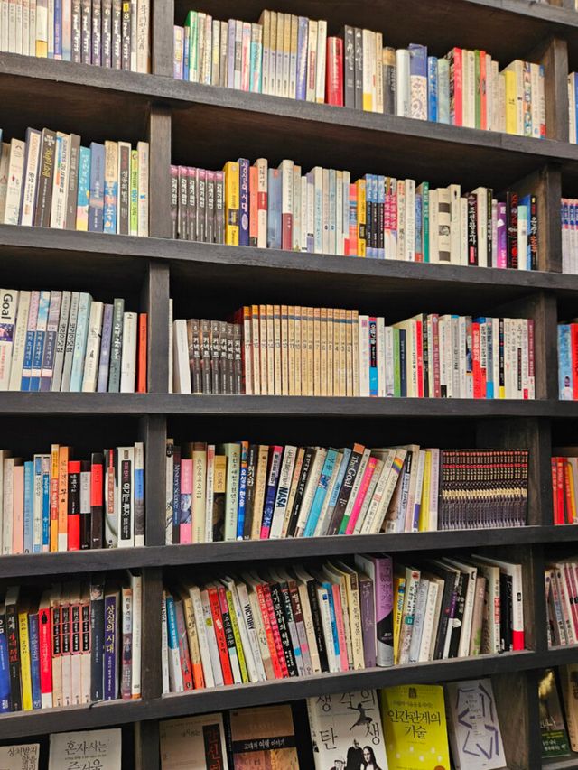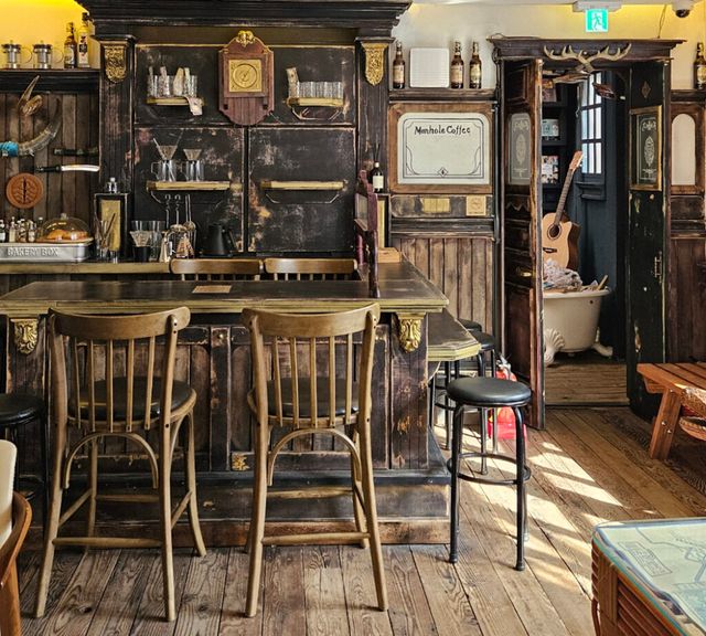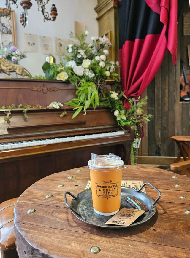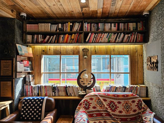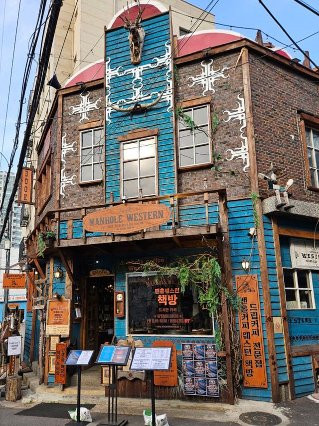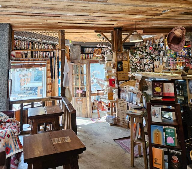 두 번째로 향한 곳은 바로 맨홀커피웨스턴책방. 미국 서부의 감성을 충실히 재현한 북카페로, 오랜 로드트립 중 잠시 들른 통나무 산장 같은 분위기를 자아낸다. 입장료를 내고 이용하는 시간제 공간으로, 책을 읽고 커피를 마시며 자유롭게 머물 수 있다.