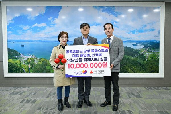 거제시 수양동에 위치한 양정 독봉스크린골프(대표 배영예, 신경복)가 15일 산불 피해 복구를 위해 성금 1000만원을 변광용 거제시장에게 기탁했다.