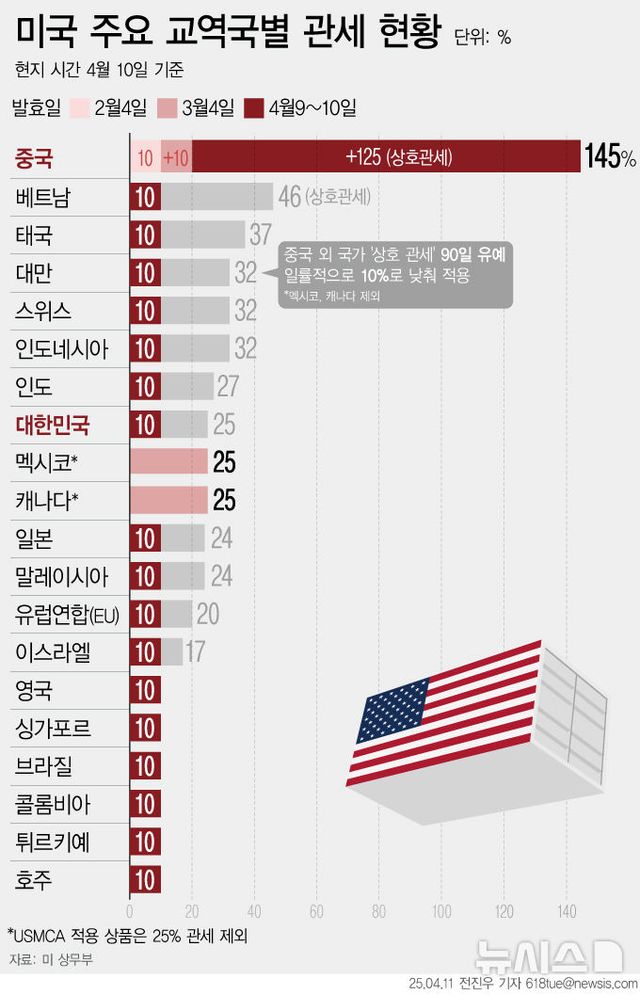 미국은 현재 EU에 알루미늄, 철강, 자동차 수입품에 25% 관세를 부과하고 있다. 상호 관세는 90일간 유예해 기본 관세 10%만 모든 수입품에 적용하고 있다.