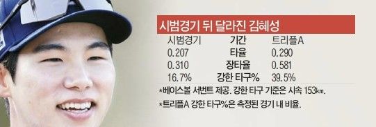 새 타격 폼이 몸에 익지 않은 스프링캠프에선 결과를 얻지 못했다. 시범경기 성적이 타율 0.207 1홈런, 출루율(0.303)과 장타율(0.310)을 합친 OPS는 KBO리그 때보다 못한 0.613에 그쳤다. 베이스볼서번트에 따르면 당시 김혜성이 때린 강한 타구(시속 153㎞ 이상) 비율은 16.7%에 불과했다.