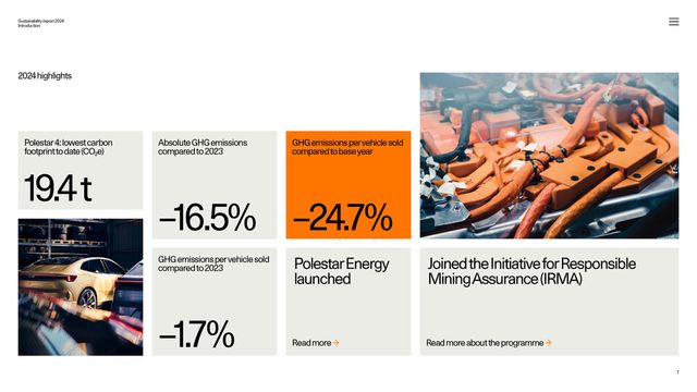 폴스타는 2020년 탄소 배출량 측정을 시작한 이래로 판매된 자동차 한 대당 탄소 발자국을 24.7% 감축했다. 이러한 성과에 가장 크게 기여한 요인으로는 전 모델에 저탄소 알루미늄 사용량을 높인 것과 배터리 생산 과정 개선, 차량 생산 시 100% 재생 전기 사용, 더 효율적인 물류 및 특정 해상 노선에서의 바이오 연료 사용 증가 등을 꼽을 수 있다.