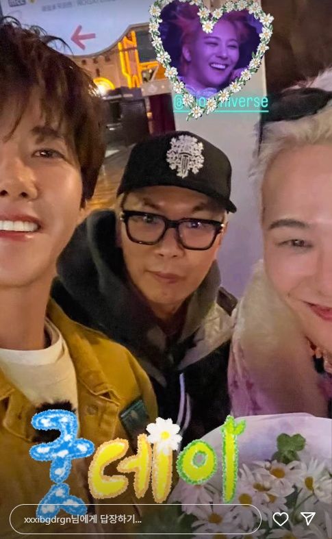 사진 속 지드래곤은 김태호 PD, 88즈 멤버 황광희와 함께 꽃다발을 들고 환한 미소를 짓고 있다.