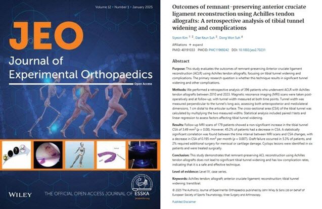 해당 연구는 2010~2023년, 본원에서 동종 아킬레스 이식건과 잔존 전방십자인대 보존술식을 적용하여 재건술을 시행한 환자 396명을 대상으로 진행되었으며, 재파열의 원인이 되는 터널 와이드닝과 합병증 여부를 중심으로 집중 분석했다.
