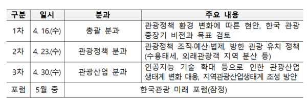 토론회는 ▴관광정책의 중장기 비전과 목표를 논의하는 총괄 분과와 ▴관광조직·예산·법제 등 정책과 함께 외래객 유치정책을 논의하는 관광정책 분과, ▴관광산업의 혁신, 지역관광 생태계를 논의하는 관광산업 분과로 나누어 진행한다.