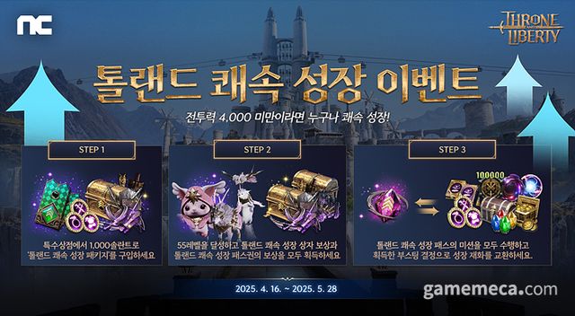 여기에 더해 신규 이벤트도 시작된다. ‘톨랜드 쾌속 성장’은 5월 28일까지 빠른 캐릭터 성장을 지원하는 이벤트다. 전투력 4,000 미만의 이용자가 특수 상점에서 1,000 솔란트(게임 내 재화)로 패키지를 구매해 참여할 수 있다.