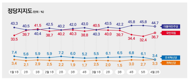 리서치뷰가 KPI뉴스 의뢰로 지난 13일~14일 전국 만 18세 이상 남녀 1000명을 대상으로 실시한 정당 지지율 조사 결과 더불어민주당 44.7%, 국민의힘 36.7%, 조국혁신당 3.4%, 개혁신당 3.3% 등으로 나타났다. 민주당은 지난 조사에 비해 1.1%p 하락했고, 국민의힘은 4.3%p 올랐다.