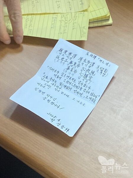 백팩 안에는 서류와 칫솔 세트, 양말, 립밤, 빗 등이 있었다. 그중에는 이날 김 후보의 캠프가 있는 대산빌딩의 경비원이 건넨 응원의 쪽지도 들어 있었다.