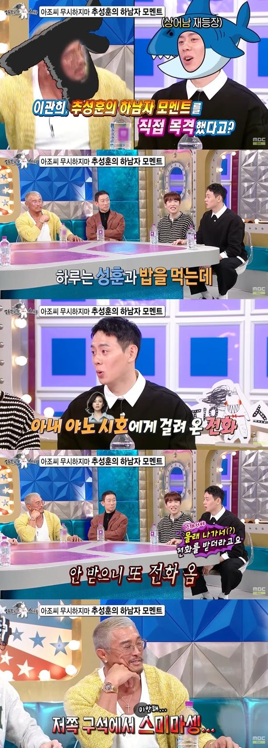 공개된 영상에서 이관희는 추성훈의 하남자 모멘트를 직접 목격했다며 "형님이 한국에 오시면 밥을 많이 사주셨다. 같이 밥을 먹는데 시호 누나한테 연락이 온 거다"라고 입을 열었다.