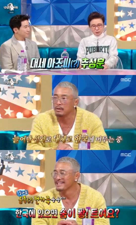 이에 추성훈은 "한국과 일본 왔다갔다하면서 당일치기 일정도 많다. 오늘도 '라스' 녹화 후에 바로 일본으로 가야한다"면서 "한국 스케줄이 있을 때는 혼자 있을 수 있어서 편하다. 숨이 트인다"고 말해 웃음을 자아냈다.