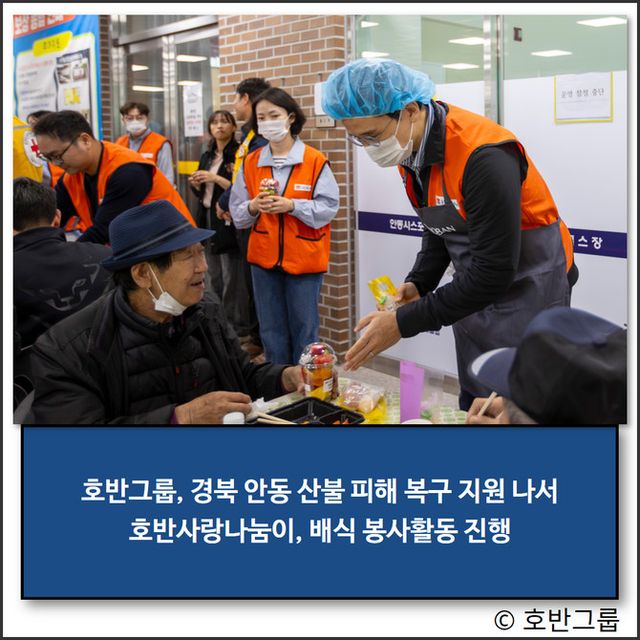 호반그룹 임직원 봉사단 '호반사랑나눔이'는 산불 피해 지역인 경북 안동시를 찾아 이재민을 위한 배식 봉사활동을 진행했다고 16일 밝혔다.