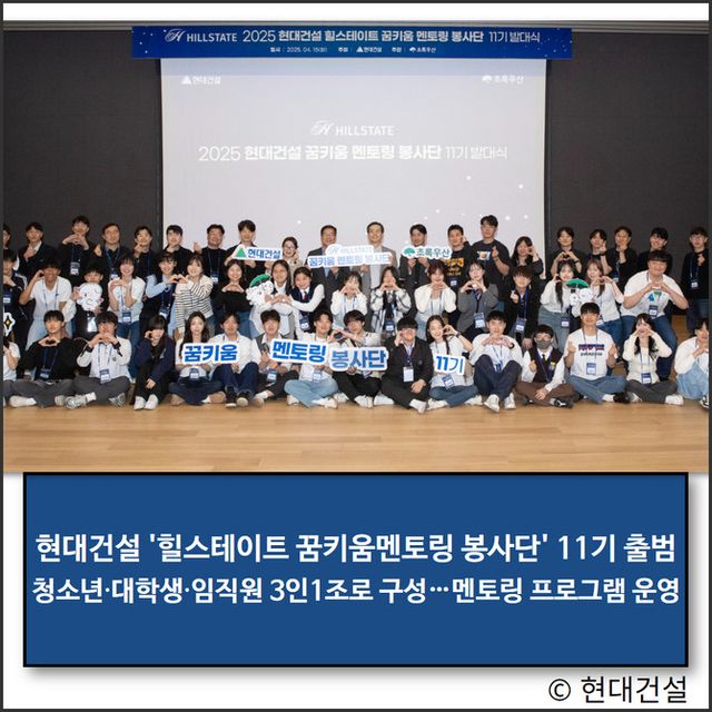 올해로 11기를 맞이한 ‘꿈키움 멘토링 봉사단’은 2014년 시작된 현대건설의 대표적인 사회공헌 프로그램이다. 청소년 멘티, 대학생 멘토, 현대건설 임직원이 한 팀을 이뤄 약 1년간 진로 설계, 학습 지도, 정서적 지지 등을 통해 실질적인 변화를 도모한다.
