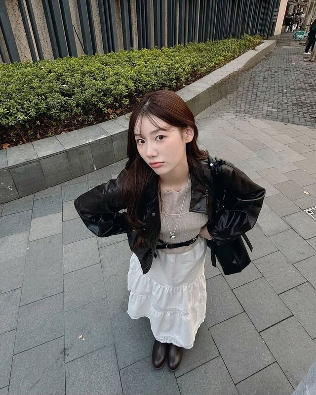 긴 길이와 가벼운 질감의 화이트 롱스커트는 봄날에 없어서는 안 될 필수 아이템이다. 이유정은 투박한 디자인의 가죽 자켓에 베이지색 니트와 벨트, 롱 화이트 스커트를 매치해 ‘반전 매력’이 돋보이는 로맨틱한 스타일을 선보였다. 간결한 디자인의 긴 실버 목걸이도 포인트!