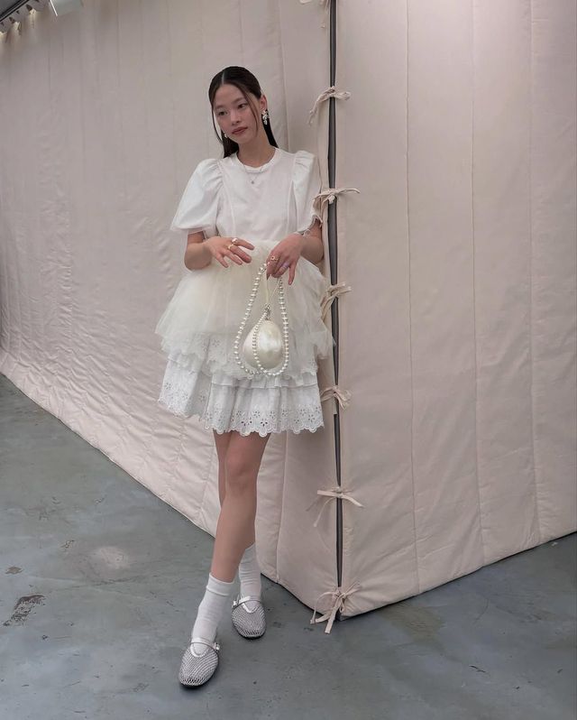 꿈속에서만 바라던 낭만적인 ‘공주 룩’을 완성하기에 화이트 스커트만큼 완벽한 아이템이 또 있을까? 윤이재는 발레리나 분위기가 돋보이는 화이트 원피스에 레이스 디테일이 더해진 스커트를 겹쳐 입어 반복적인 일상에 활기를 더해줄 화이트 룩을 선보였다. 귀여운 진주 모티프 가방과 네트 플랫 슈즈도 룩에 완성도를 높인다.