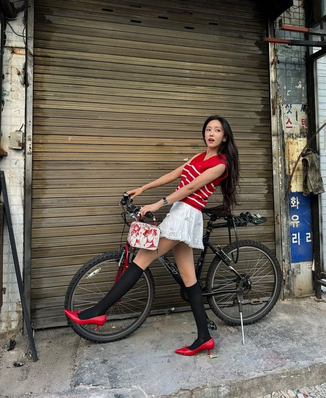 어떤 컬러의 상의와도 자연스럽게 어우러지며 완벽한 룩을 연출하기에 좋은 화이트 미니스커트. 효민은 강렬한 레드 컬러의 니트 베스트에 로맨틱한 디자인의 화이트 미니스커트를 매치했다. 여기에 검정 니 삭스와 레드 컬러의 가방, 하이힐을 더해 멀리서도 시선을 사로잡는 뚜렷한 존재감의 데일리 룩을 완성했다.