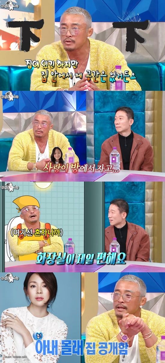 이날 추성훈은 남자의 자존심을 잃었다고 밝혔다. 그는 "집이 있긴 하지만 (집 안에서) 제 자리가 없다. 전 사랑이 방에서 자고, 사랑이 밥도 만들어준다"며 토로했다.