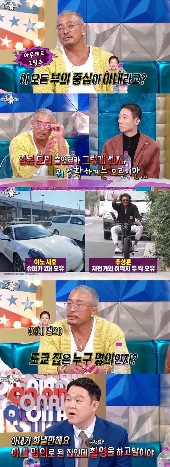 도쿄 집은 누구 명의냐는 질문에는 "와이프 명의"라고 말했고, 이를 들은 김구라는 "아내가 화낼만하다. 명의도 내 명의인데 촬영을 하고 말이야"라고 말을 얹었다.