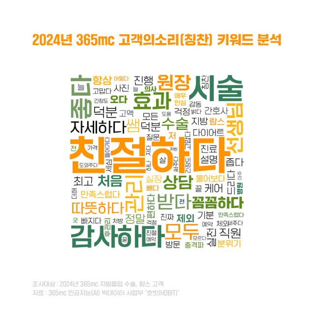 365mc AI 빅데이터 사업부 호빗(HOBIT)은 ‘고객의 소리(칭찬)’에서 나온 키워드를 2022년 ~ 2024년 총 3년간 연도별, 높은 빈도 순으로 분류한 결과를 17일 발표했다. 365mc는 ‘고객 중심’ 맞춤 서비스의 일환으로 지난 2011년부터 고객의 소리함을 마련해 고객과 소통하고 있다. 이 소리함에는 고객이 직원에게 보내는 칭찬글부터 △병원 이용간 불편사항 △시·수술간 궁금한 사안 후기 등이 담긴다.