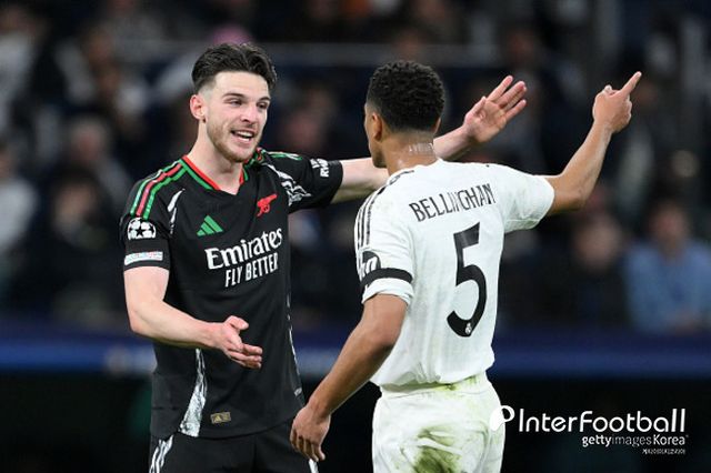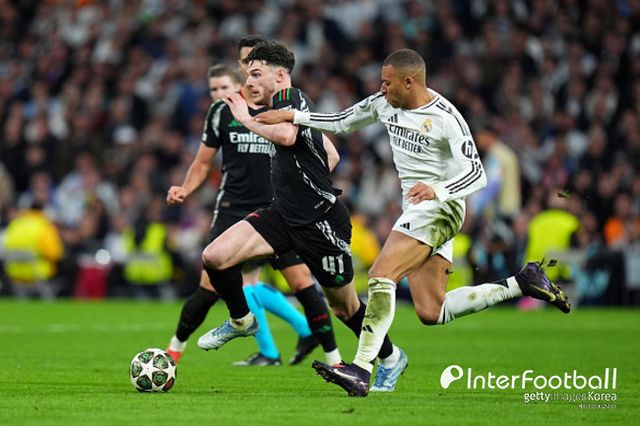 [인터풋볼] 주대은 기자 = 아스널 미드필더 데클란 라이스가 레알 마드리드전 최우수 선수(POTM)에 올랐다.