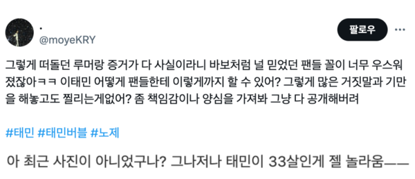 특히 과거 샤이니 키가 SNS에 올린 태민의 복장과 상당 부분 일치해 추측에 힘을 더하고 있다.