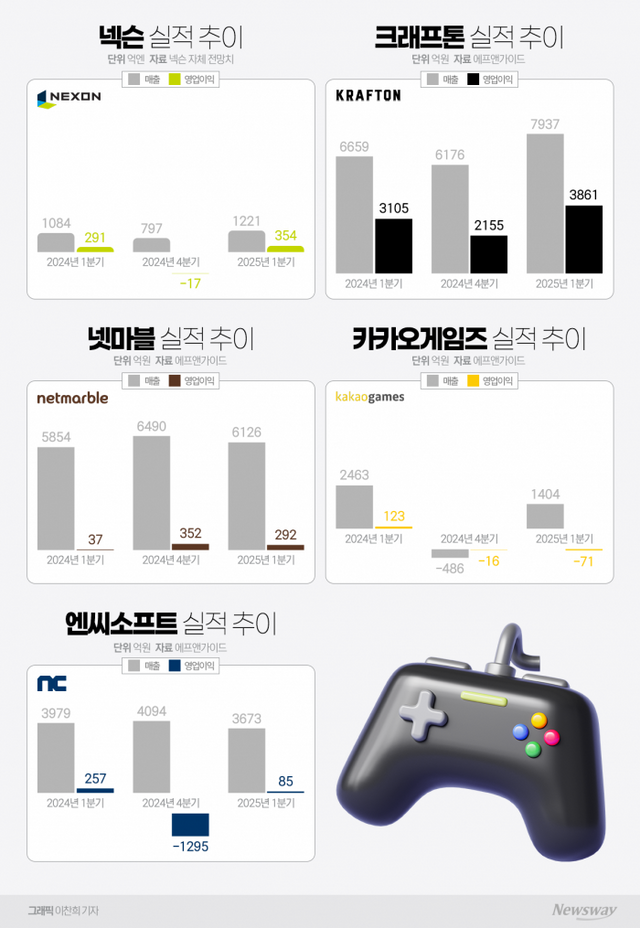 올해 1분기 주요 게임사 실적 희비가 갈렸다. 그래픽=박혜수 기자
