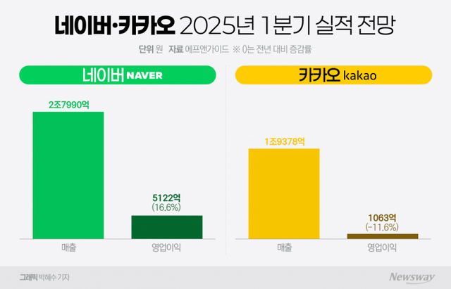 17일 금융정보업체 에프앤가이드에 따르면 올해 1분기 네이버의 실적 전망치(컨센서스)는 매출 2조7990억원, 영업이익은 5122억원이다. 이는 전년 동기 대비 각각 10.81%, 16.6% 오른 수준이다.