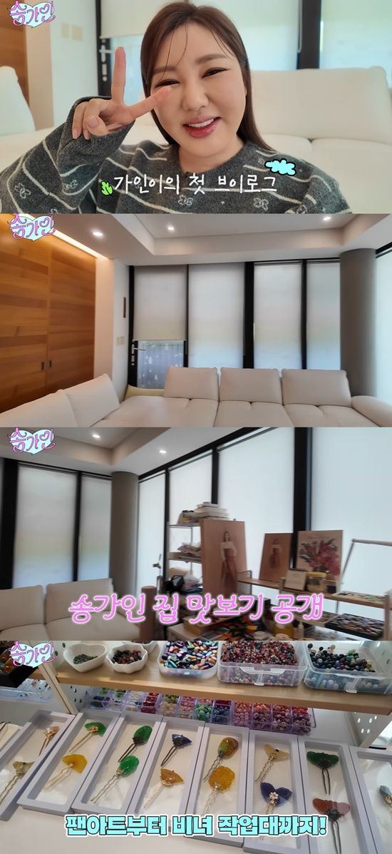 송가인의 집은 화이트 톤의 깔끔한 내부 인테리어와 사랑이 느껴지는 팬아트 공간, 직접 만든 비녀들과 비녀 작업대까지 취향을 엿볼 수 있어 눈길을 끌었다. 또한 그는 채널에서 본격적인 집 공개도 할 것을 예고했다.