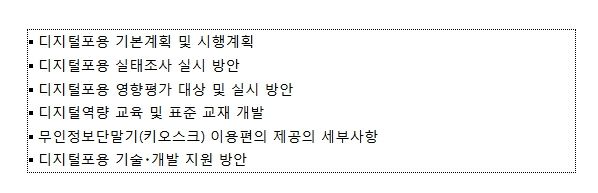 과기정통부는 「디지털포용법」이 현장에서 효과적으로 적용되어 시행될 수 있도록 정책, 산업, 역량교육, 접근성 분과로 구성된 하위 법령 자문단을 운영할 계획이다. 자문단에는 과기정통부와 학계·법조계 전문가 및 산업계 전문가가 참여하여, 「디지털포용법 시행령」 및 과기정통부 고시의 제정 과정에서 법령의 실효성을 높일 수 있도록 자문을 제공할 계획이다.