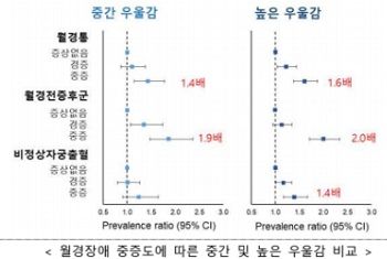 분석 결과, 월경통, 월경전증후군, 비정상 자궁출혈 증상이 없는 여성에 비해 중증 증상을 경험한 여성에서 높은 우울감을 겪는 비율이 각각 1.6배, 2.0배, 1.4배 높게 나타났다.