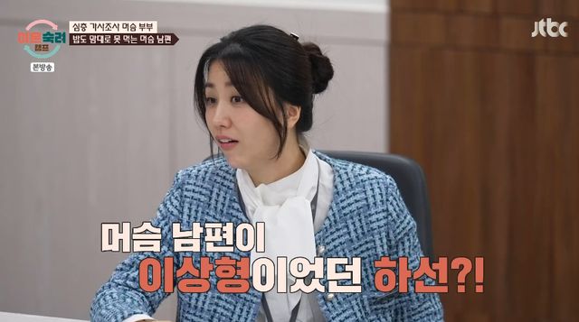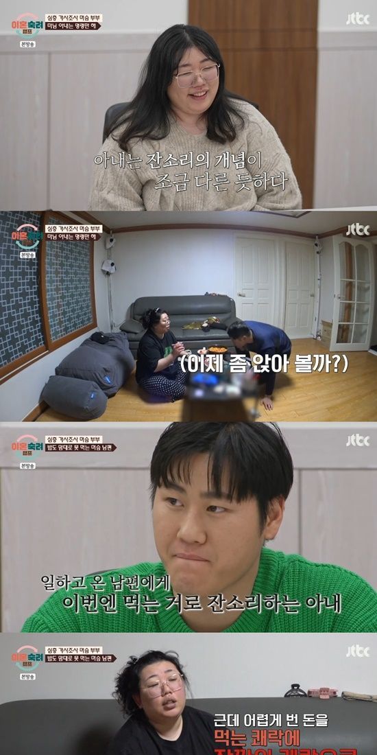 아내는 "잔소리가 아니라 답답해서 말하는 거다. 그게 잔소리가 되냐"고 자신의 모습을 부정했다. 뿐만 아니라 먹는 걸로도 잔소리하는 모습을 보였고, 이후 남편은 아내 몰래 음식을 먹기도 했다.
