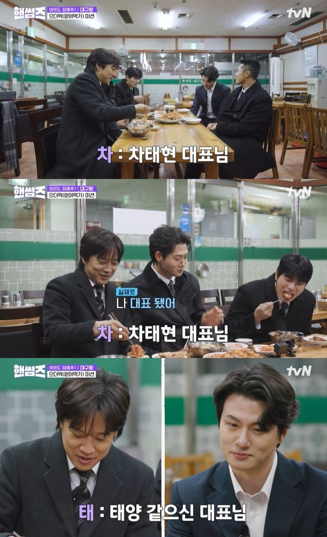 이어 신승호는 '태'양 같으신 대표님, '현'명한 판단 부탁드립니다"라며 센스 있는 삼행시를 선보였다. 이에 빵 터진 차태현은 볼찜을 듬뿍 담아 건네는 통 큰 '대표'의 복지를 선보였다.