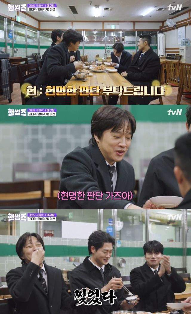 17일 방송된 tvN '핸썸가이즈'(이하 '핸썸즈')에서는 차태현, 김동현, 이이경, 신승호, 오상욱이 직장인들의 메뉴 고민을 해결하기 위해 '맛집 투어'에 나선 장면이 전파를 탔다.