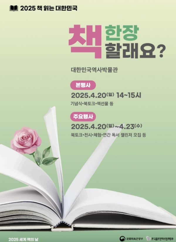이 밖에도 ‘책 읽는 대한민국’ 캠페인의 시작을 알리는 다양한 행사도 대한민국역사박물관 1층과 야외 역사 마당에서 열린다. ‘북클럽 성향분석존’과 ‘북클럽 안내존’을 마련해 개인별 성향 분석을 통한 맞춤형 ‘북클럽’을 추천한다. ‘북멘토 서재전’에서는 ‘북멘토’가 추천하는 책을 살펴볼 수 있고, ‘한 장 추천 도서전’과 ‘한 장 오디오북존’에서는 지역과 온라인 서점, 도서관 등이 추천한 책을 보고 소리책(오디오북)을 체험할 수 있다. ‘한 장 그림책전’에서는 어린이와 가족 단위 방문객들이 2023년과 2024년 대한민국 그림책상 수상 도서를 감상하고 컵방울 만들기 등 그림책 속 활동을 체험할 수 있다. 포스터를 찍어 인스타그램에 올리고 4월 23일까지 안내소에서 인증하면 추첨을 통해 100명에게 ‘커피 기프티콘’도 증정한다.