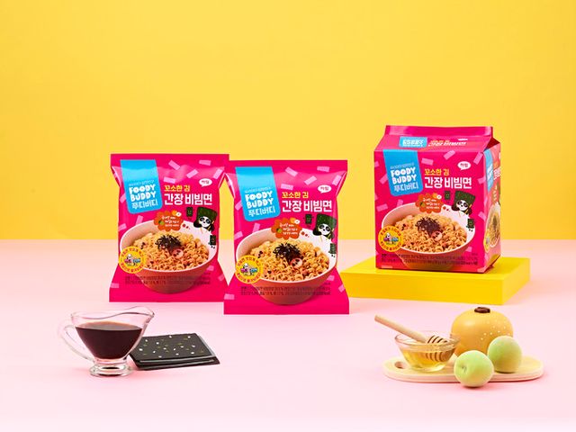 푸디버디 '고소한 김 간장비빔면'은 간장에 국산 아카시아꿀, 배, 매실 등으로 건강하게 달콤한 맛을 낸 어린이 전용 비빔면 제품으로 봉지와 컵 두 가지 타입으로 출시됐다. 고추장이 아닌 간장을 베이스로 맛을 내 맵지 않고, 구운 김과 참기름을 넣어 고소한 풍미를 한층 살렸다. 여기에 푸디버디 라면의 시그니처인 귀여운 판디(판다) 캐릭터 어묵을 더해 아이들이 식사 시간을 놀이처럼 즐길 수 있도록 했다.