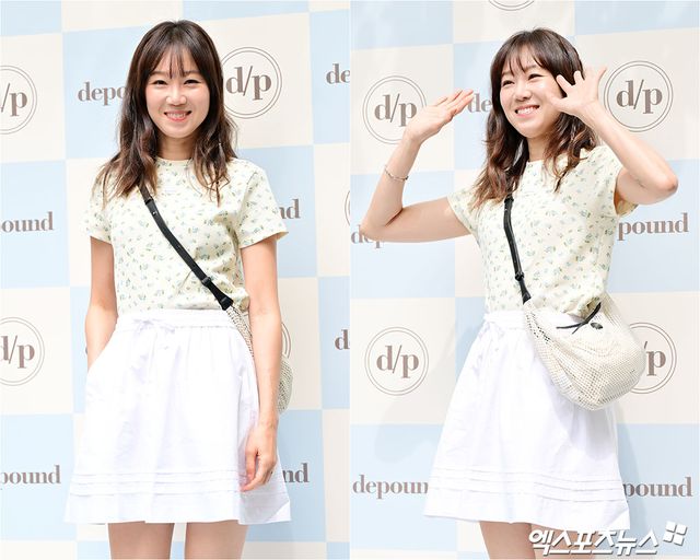 이날 공효진은 연노랑 바탕에 잔잔한 플라워 패턴이 더해진 반소매 티셔츠에, 미니 기장의 화이트 스커트를 매치해 밝고 경쾌한 봄 분위기를 연출했다. 허리 밴딩이 가미된 스커트는 자연스러운 A라인 실루엣을 형성하며 활동성을 더했다.
