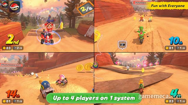 그 외에도 지인과 함께 게임을 즐기고 싶은 플레이어는 화면을 분할해 하나의 기기로 최대 4명까지 플레이할 수 있다. 소프트웨어와 본체를 각자 가지고 있다면 최대 8명까지 로컬 멀티 플레이가 가능하며, 전세계 유저들과 온라인 대전 역시 지원한다.