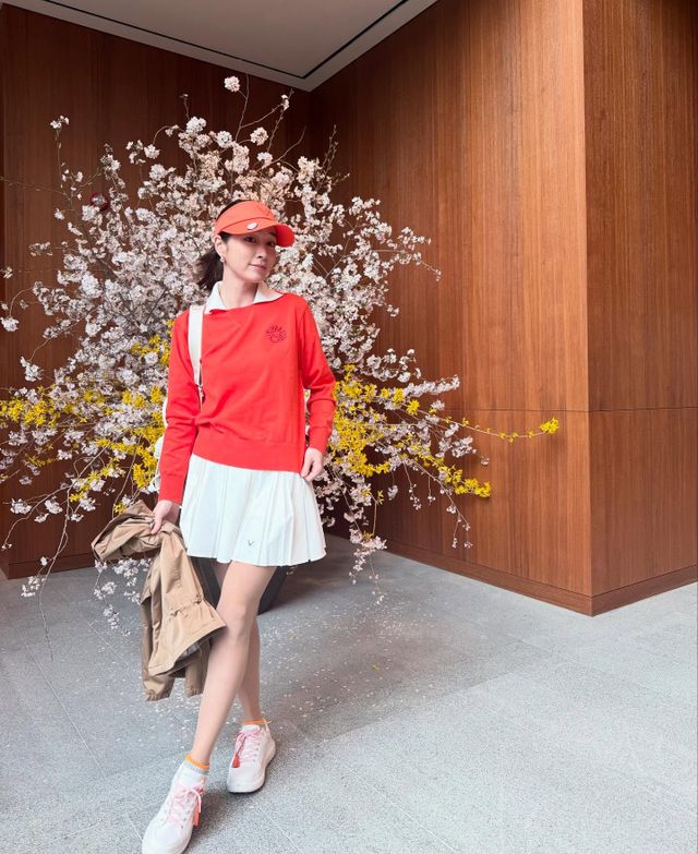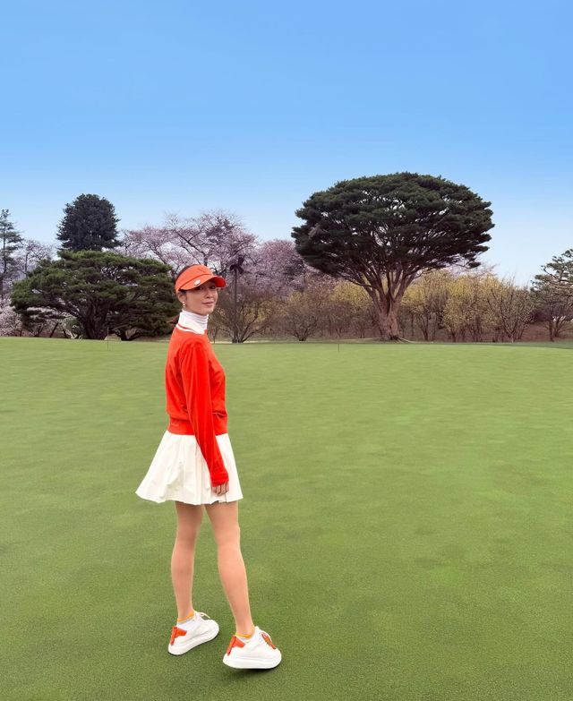 사진 속 이민정은 레드 컬러의 니트와 화이트 컬러의 스커트를 입고 골프 웨어를 입고 골프장에서 미모를 자랑하고 있다.