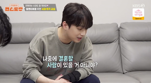 이찬원 배 사과 깎기 대회도 열렸다. 이찬원은 두 친구에게 “나중에 결혼할 사람이 있을 거아냐. 예비 장모님에게 점수를 어느정도 따느냐”라고 심사기준을 밝혔다.