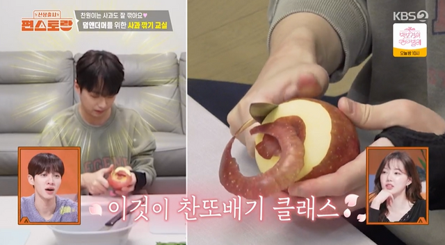 이어 세 사람은 사과 깎기에 도전했다. 칼질이 서툰 황윤성과 김중연과 달리 이찬원은 능숙하게 칼날을 안쪽으로 두고 끊기는 법 없이 거침없이 깎아내 눈길을 끌었다.