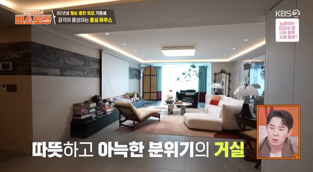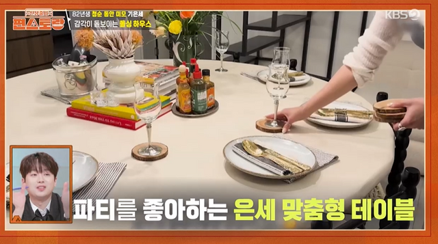 기은세는 “공을 들여 가꿨다”며 직접 인테리어에 참여했음을 밝혔다. 이어 홈 다이닝이 차려지는 원형 식탁을 두곤 “최대한 8명까지 앉을 수 있는 식탁을 집에 두려했다”고 설명했다.