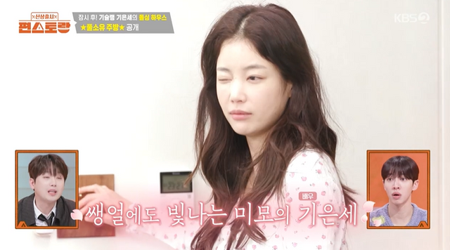 이날 기은세는 아침에 눈을 뜨고 주방으로 향했다. 잠옷을 입고 손질 안된 머리의 기은세 비주얼에 이찬원은 “지금 화장이 하나도 안 되어있는데 이야”라고 감탄했다.