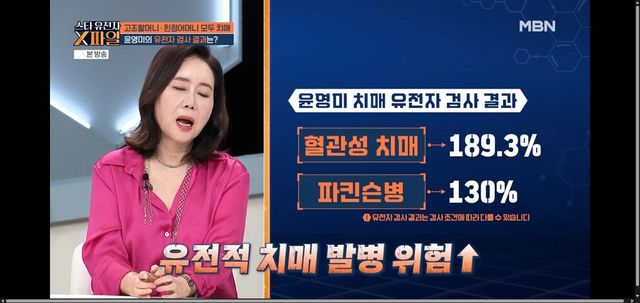 스튜디오에서는 윤영미의 치매 관련 유전자 검사 결과가 공개됐다. 박주홍 한의학·의학 박사는 “혈관성 치매 발병 위험률이 189.3%로 한국인 평균을 100%라고 봤을 때 거의 2배에 가깝게 나왔다”고 말했다. 윤영미는 충격적 결과에 망연자실해했다.