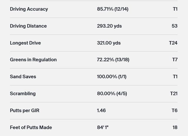 김시우는 드라이브 평균 거리 293.20야드, 최장타 321야드, 페어웨이 안착률 85.71%(12/14), 그린적중률 72.22%(13/18), 스크램블링 80%(4/5), 샌드세이브 100%(1/1), 홀당 퍼트수 1.46개를 기록했다.