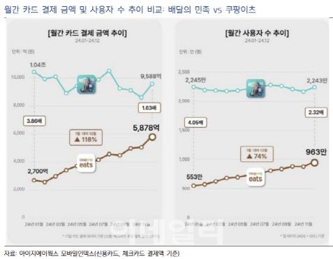 쿠팡의 배달 앱 카드 결제액 점유율은 2024년 1월 18%에서 12월에 35%까지 상승했고, 주력 경쟁사인 배달의 민족(우아한형제들)은 2024년 영업이익률(별도기준 2023년 21.2%→2024년 14.2%, 연결기준 2023년 20.5%→2024년 14.8%)이 전년대비 크게 하락한 상황이다.