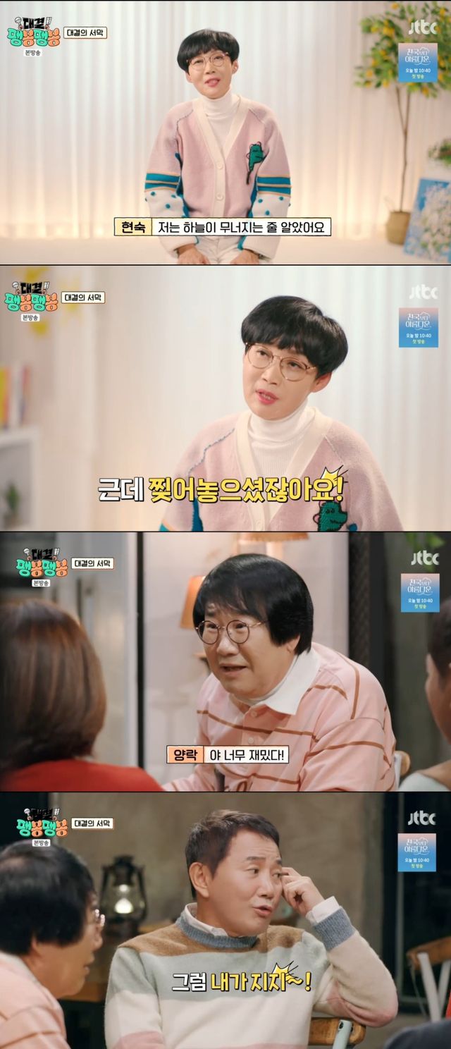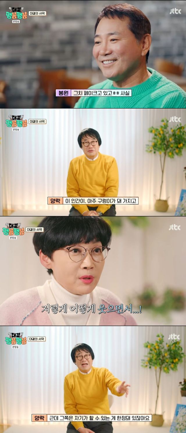 19일 첫 방송된 JTBC '대결! 팽봉팽봉'(이하 '팽봉팽봉')에서는 팽현숙과 이봉원이 협동 장사가 아닌 경쟁이라는 것을 뒤늦게 알게 된 장면이 전파를 탔다.