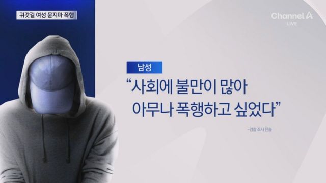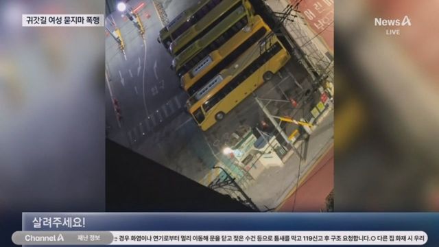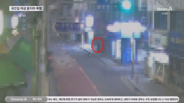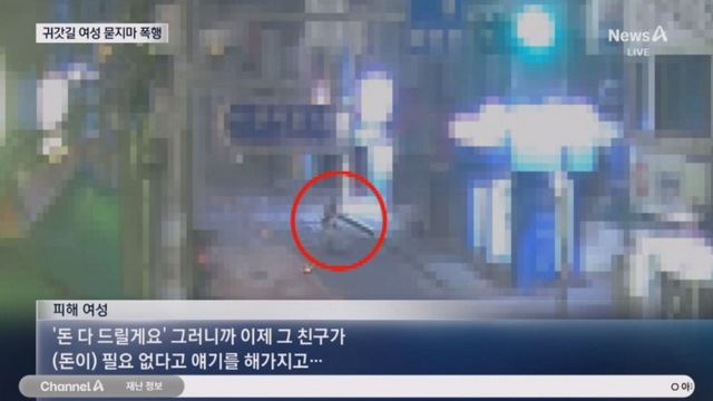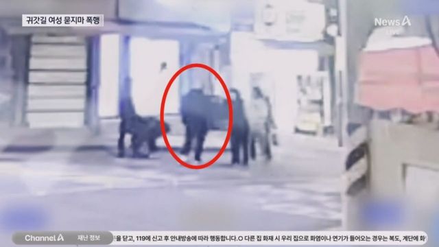 당황한 여성은 이리저리 피하다 넘어졌고, 남성은 여성을 붙잡아 넘어뜨리고 발로 걷어찹니다.