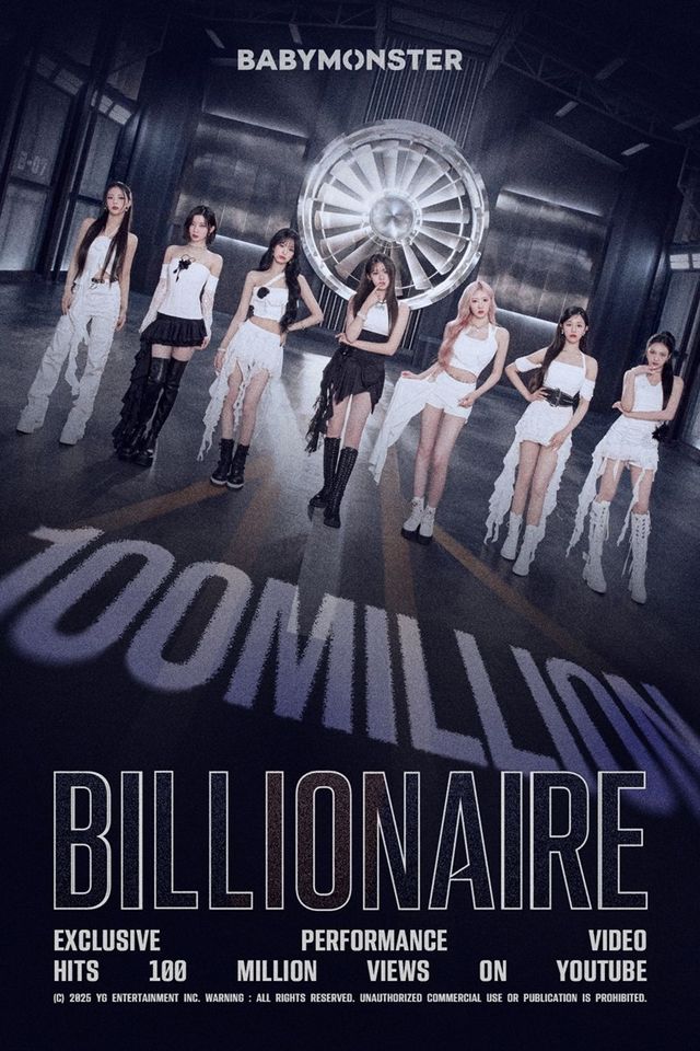 20일 YG엔터테인먼트에 따르면 베이비몬스터의 정규 1집 수록곡 'BILLIONAIRE' 익스클루시브 퍼포먼스 비디오는 이날 오전 6시 30분 유튜브 조회수 1억 회를 넘어섰다. 지난 2월 7일 공개된 지 약 72일 만이다.