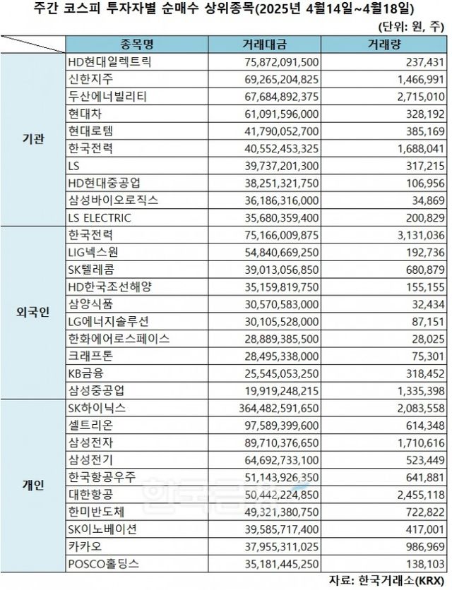 기관 'HD현대일렉트릭'·외인 '한국전력'·개인 'SK하이닉스' 1위 [주간 코스피 순매수- 2025년 4월14일~4월18일]