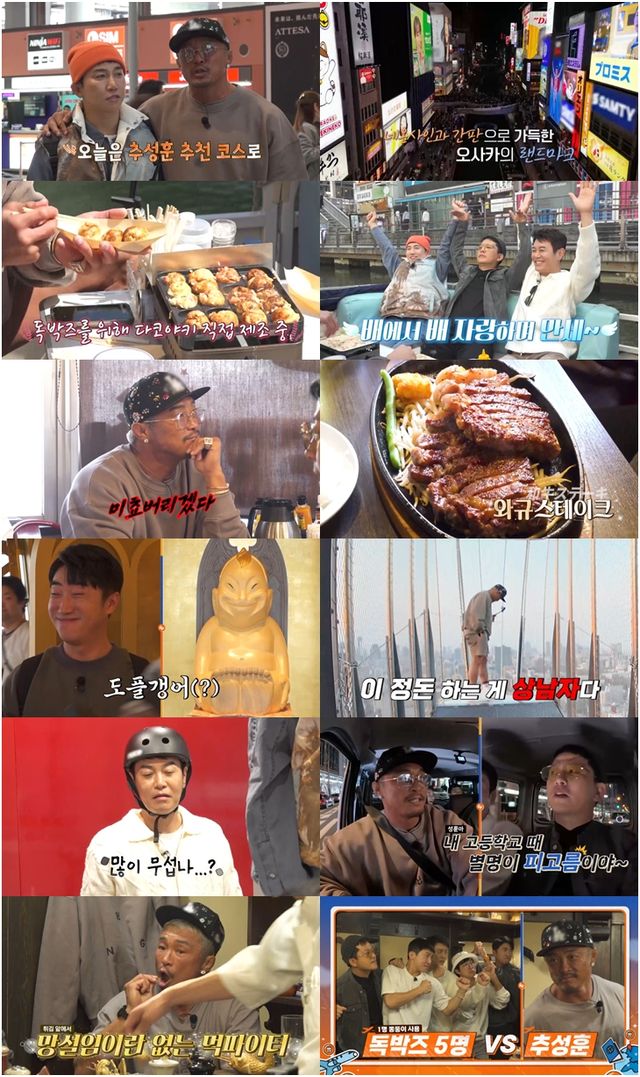 이후, 추성훈은 오사카의 대표 번화가인 ‘도톤보리’로 손수 차를 몰아 ‘독박즈’를 데리고 갔다. 이곳에서 이들은 ‘글리코상’을 배경으로 단체사진을 찍었으며, 추성훈이 예약한 ‘다코야끼 크루즈’에 탑승했다. 배 위에서 추성훈이 손수 만들어준 다코야끼를 맛본 이들은 행복해했고, ‘크루즈 비용’을 건 독박 게임에서는 추성훈이 제안한 ‘일본식 눈치 게임’을 한 결과, 또 다시 추성훈이 독박자가 됐다. 두 번 연속 독박에 걸린 추성훈에게 김대희는 “화 났냐”라고 물었는데 그는 “괜찮다!”며 쿨하게 웃었다.