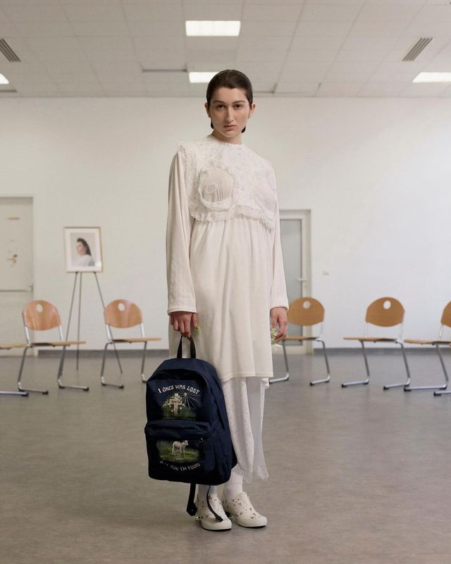 제니 팩스는 가방 고리를 손잡이로 들어, 메는 순간 캐주얼해지는 백팩으로 정적인 분위기를 연출했어요.